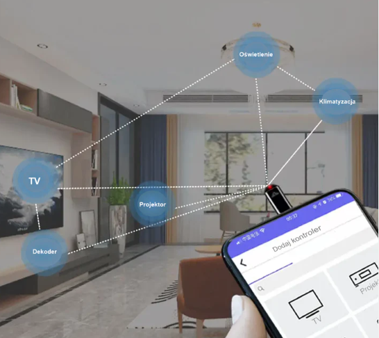 - Steruje urządzeniami na podczerwień (TV, klimatyzacja, dekoder)